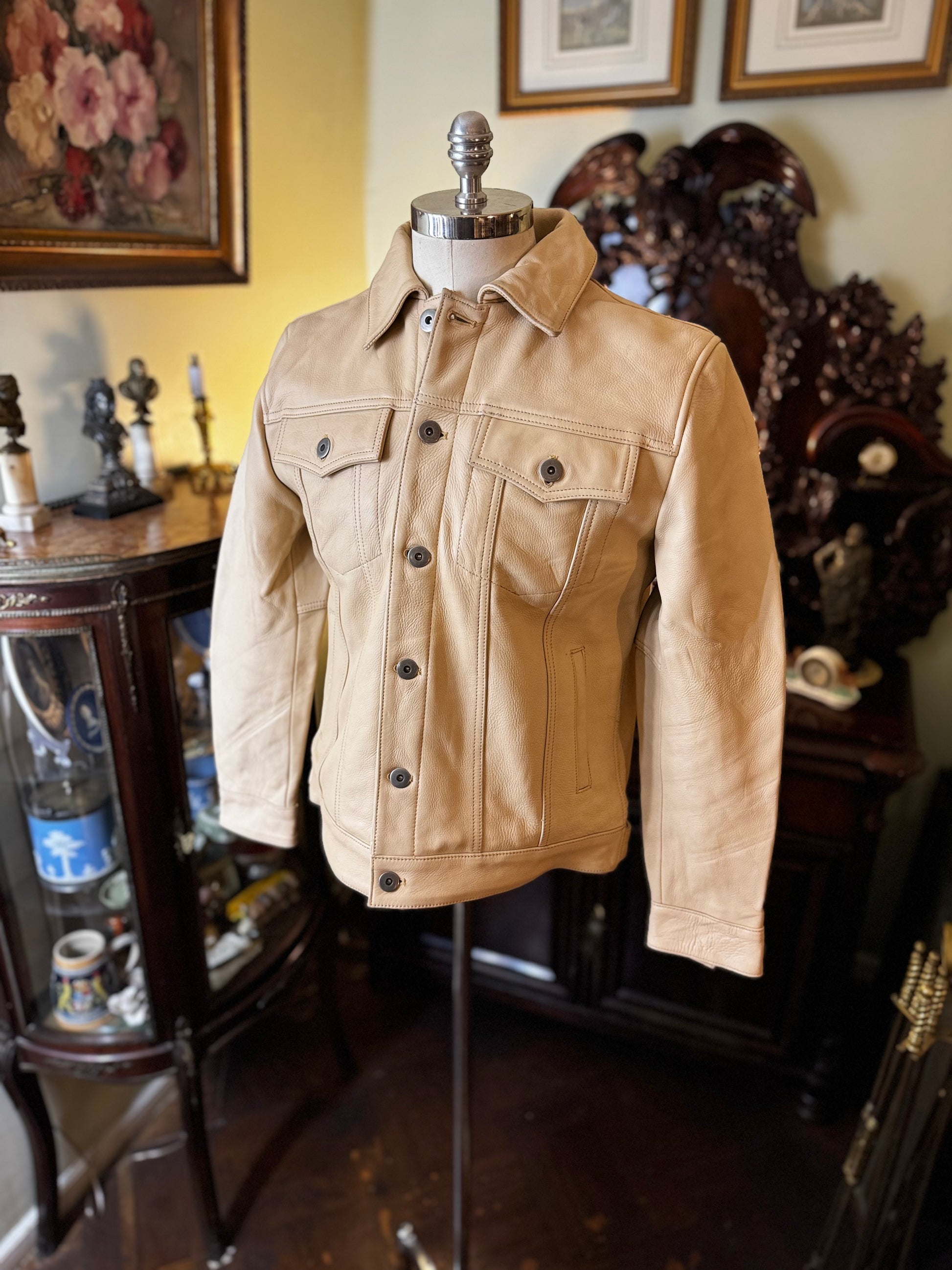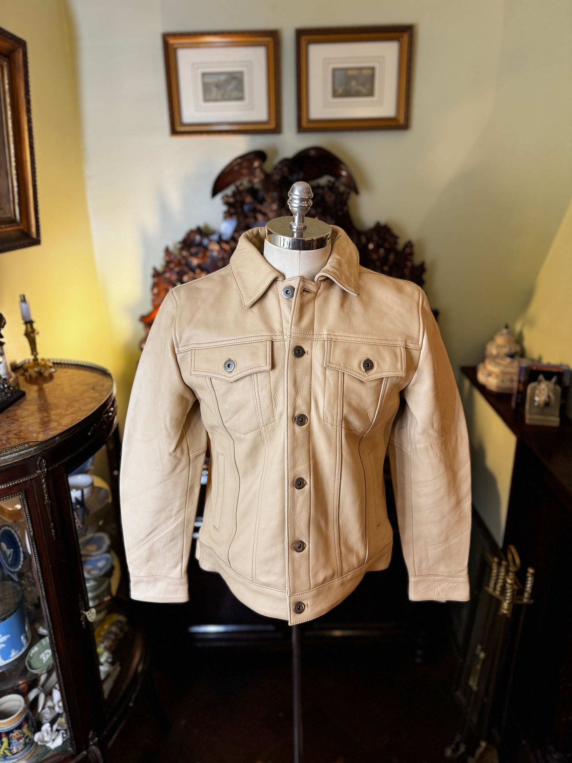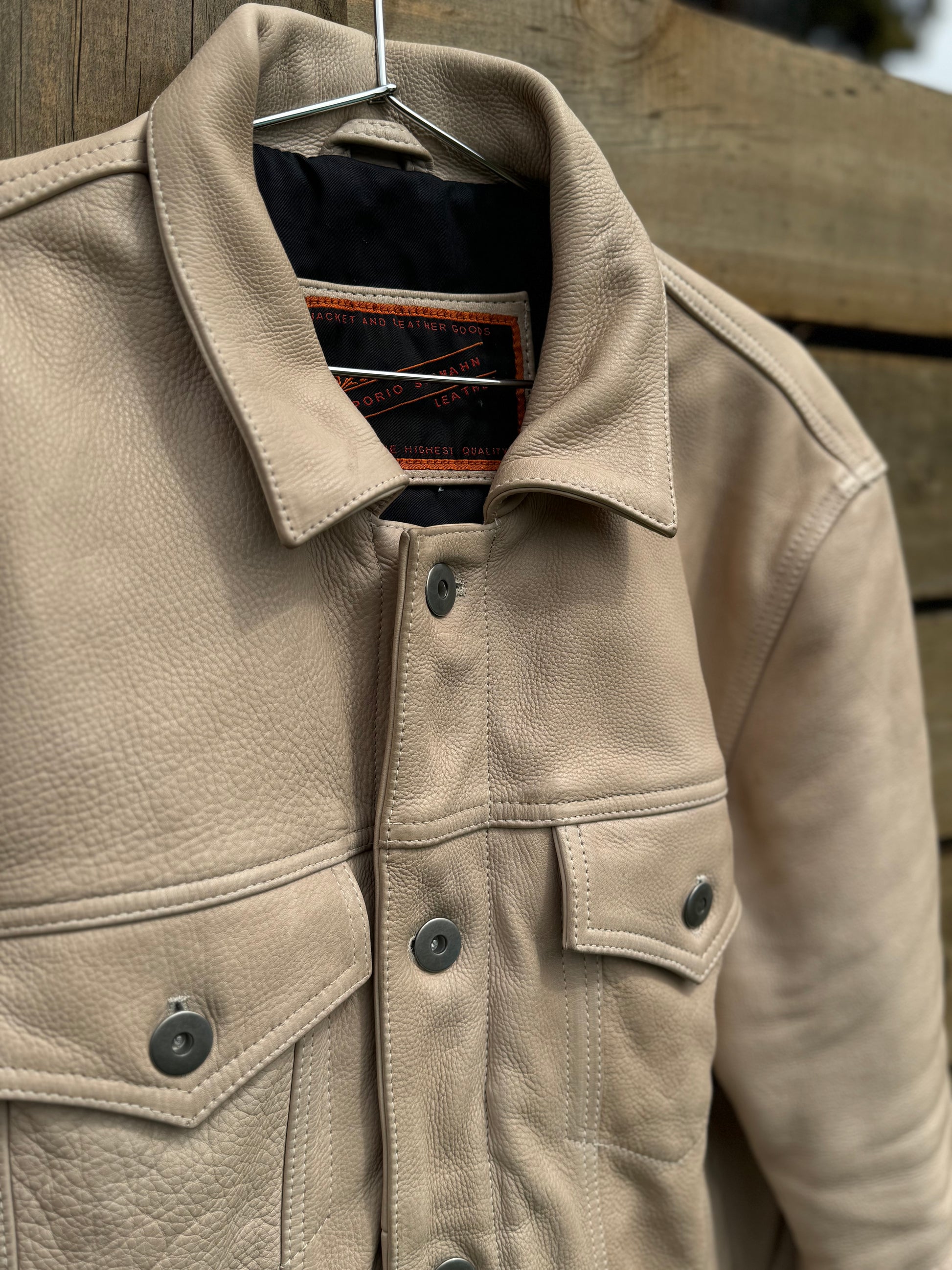 Descubre la chaqueta "Master Trucker", una pieza inspirada en el clásico modelo Levi's Type 3 o camionero. Fabricada con cuero de vaca de grano completo y curtido vegetal, su grosor de 1.4 mm garantiza durabilidad y carácter. El tono crema original evolucionará gradualmente hacia un beige único que añade personalidad con el tiempo. El interior de algodón de sarga negro ofrece comodidad, mientras que las mangas cuentan con satín negro de lujo para facilitar el deslizamiento. Con dos bolsillos internos, uno abierto y otro con cierre, es perfecta para quienes buscan estilo y funcionalidad en una sola prenda.