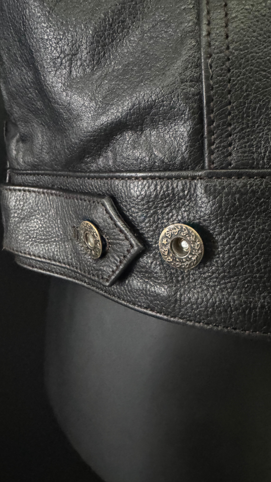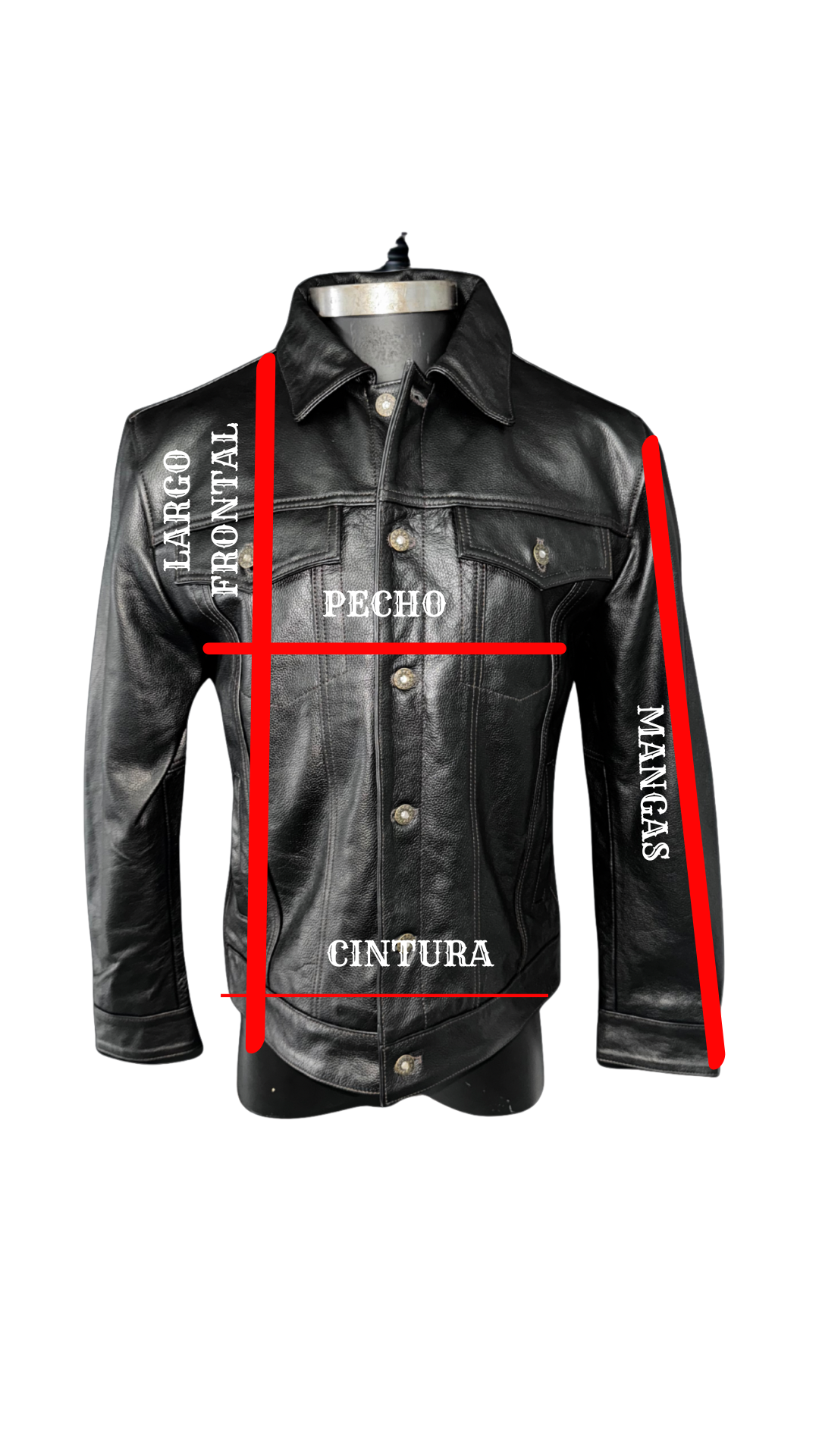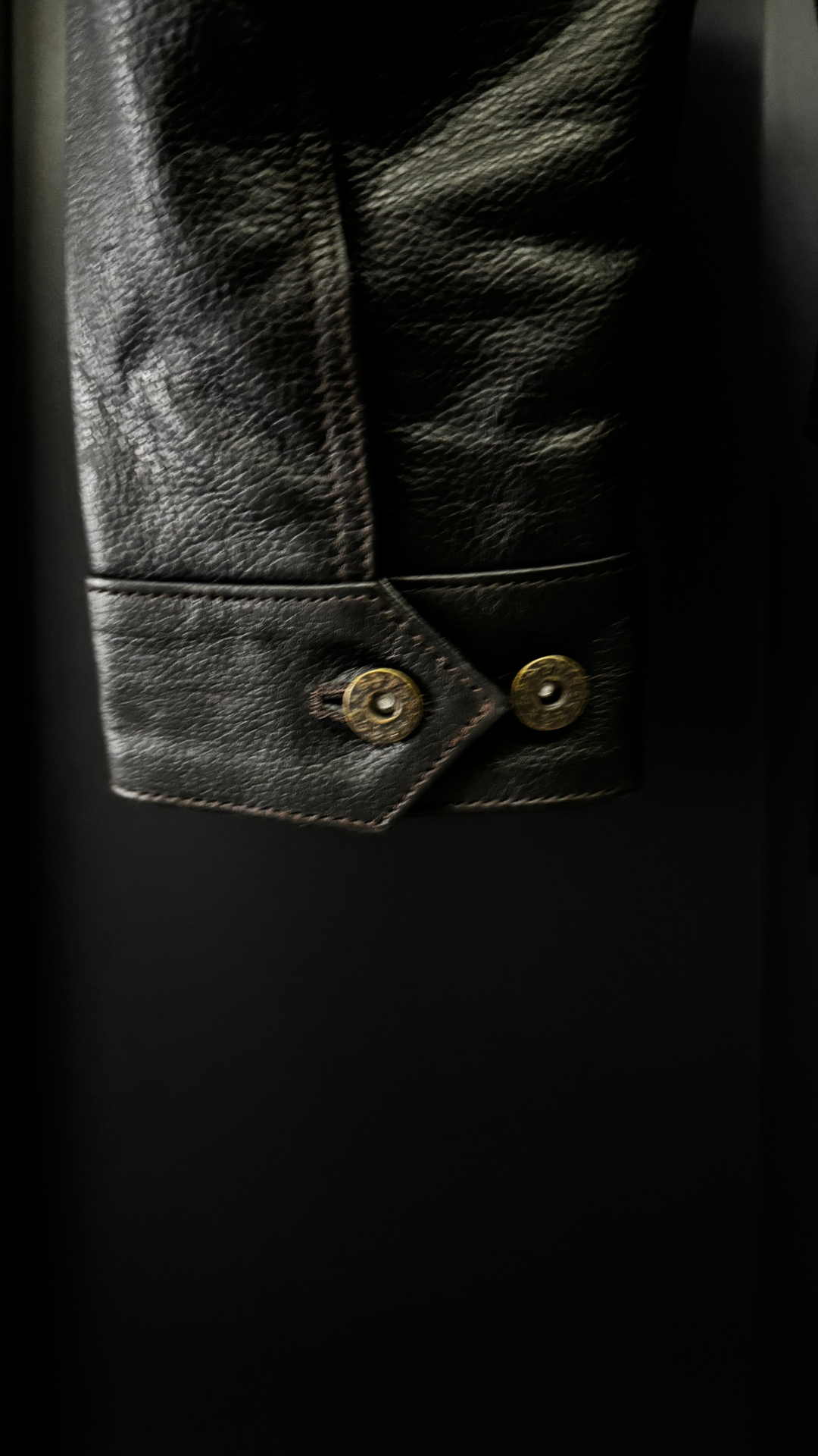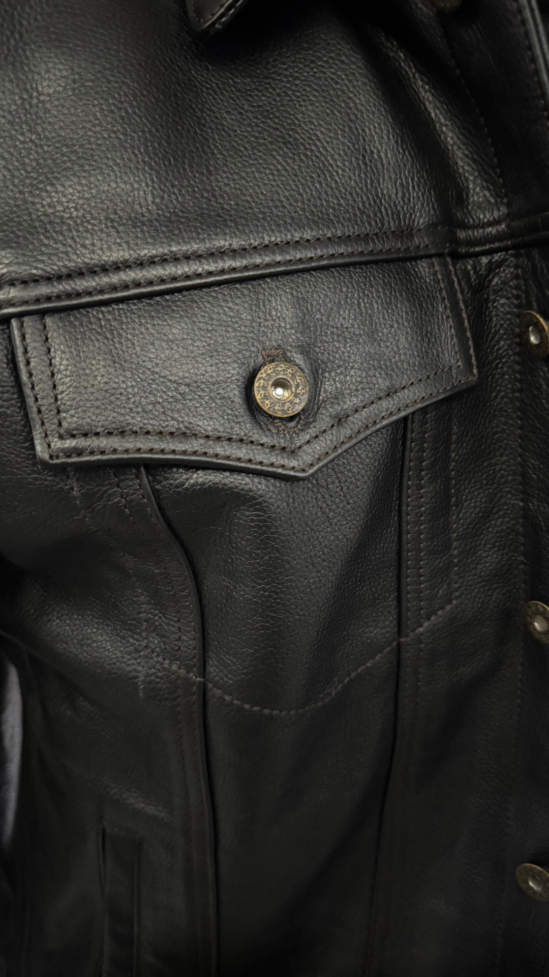 Confeccionada en cuero full grain de vacuno de 1.2 mm, ofrece una presencia sólida, textura natural y la durabilidad que solo la piel de primera calidad puede brindar. Cada costura —realizada con hilo Dark Brown— resalta el carácter robusto de la prenda, mientras que los botones de latón vintage personalizados aportan ese toque clásico que envejece con dignidad y personalidad.
