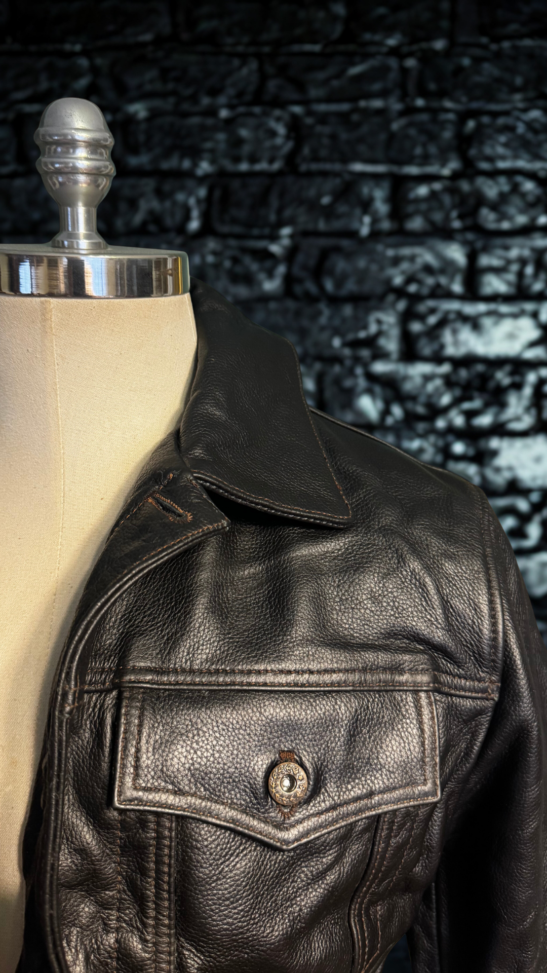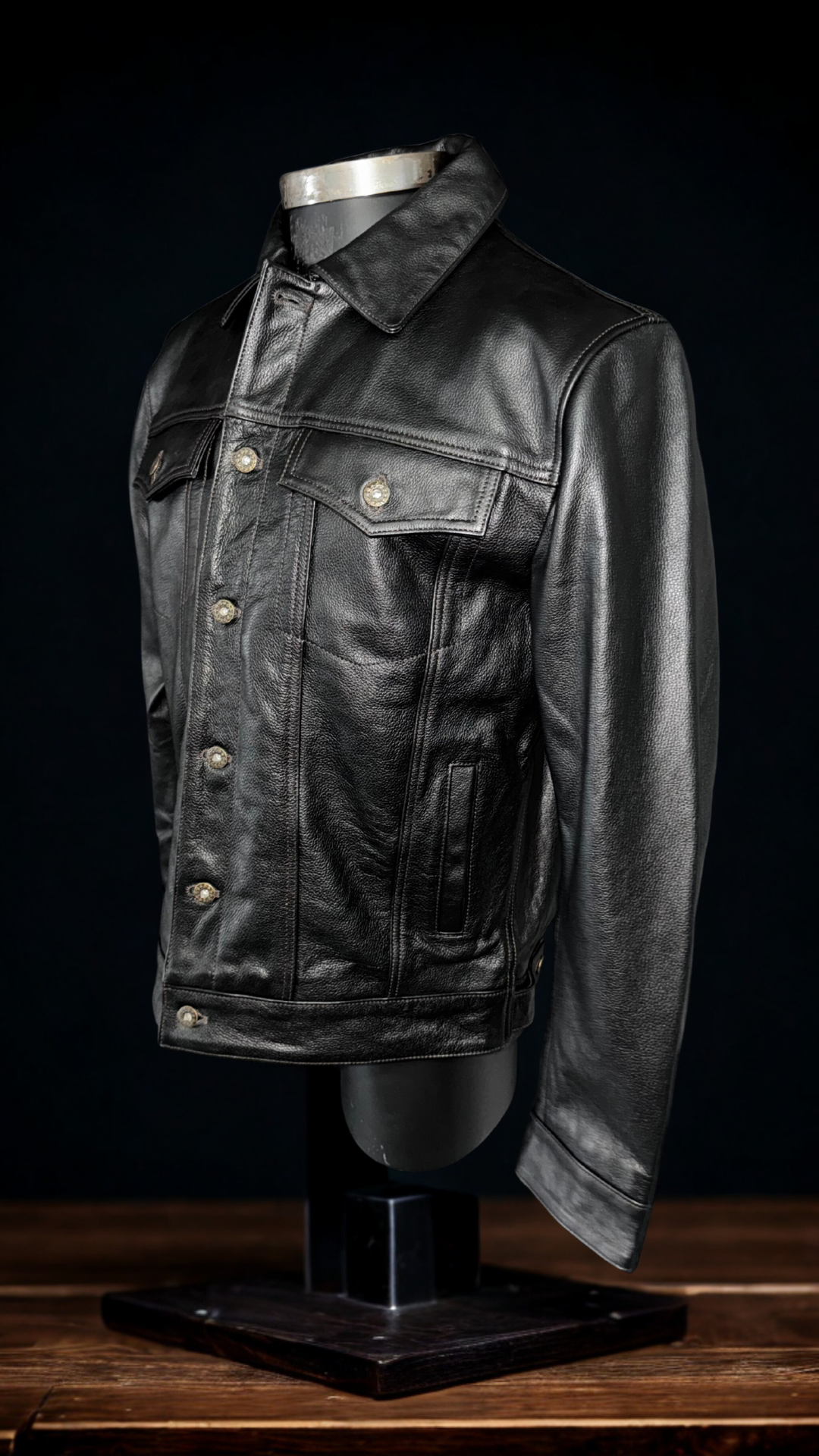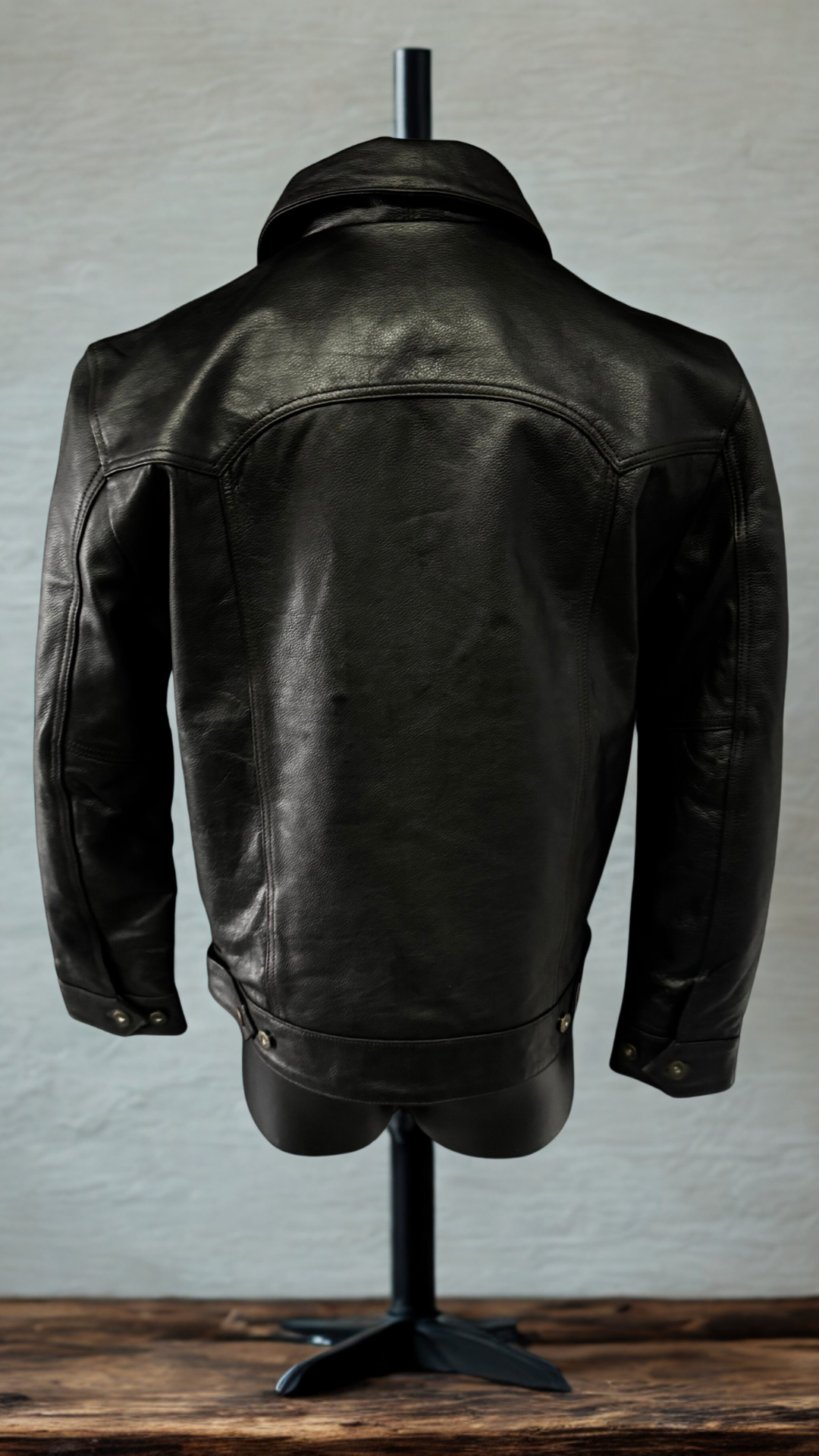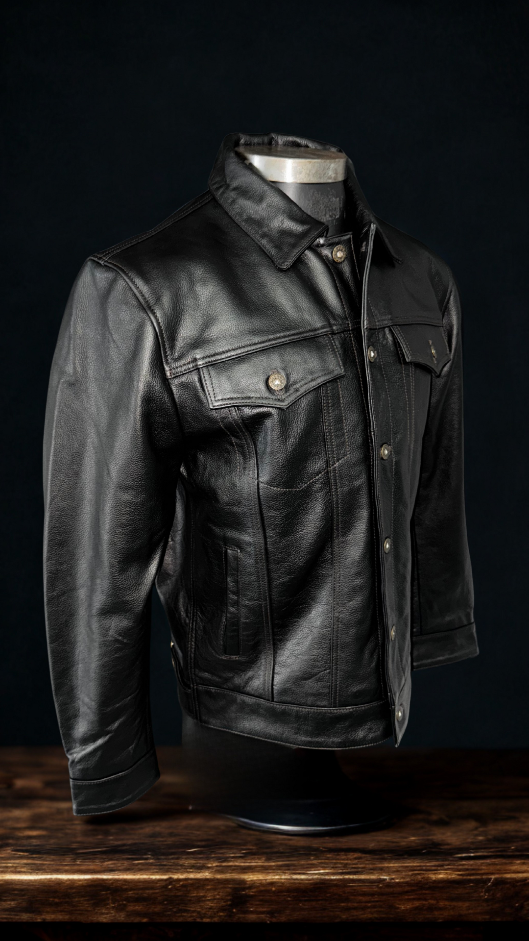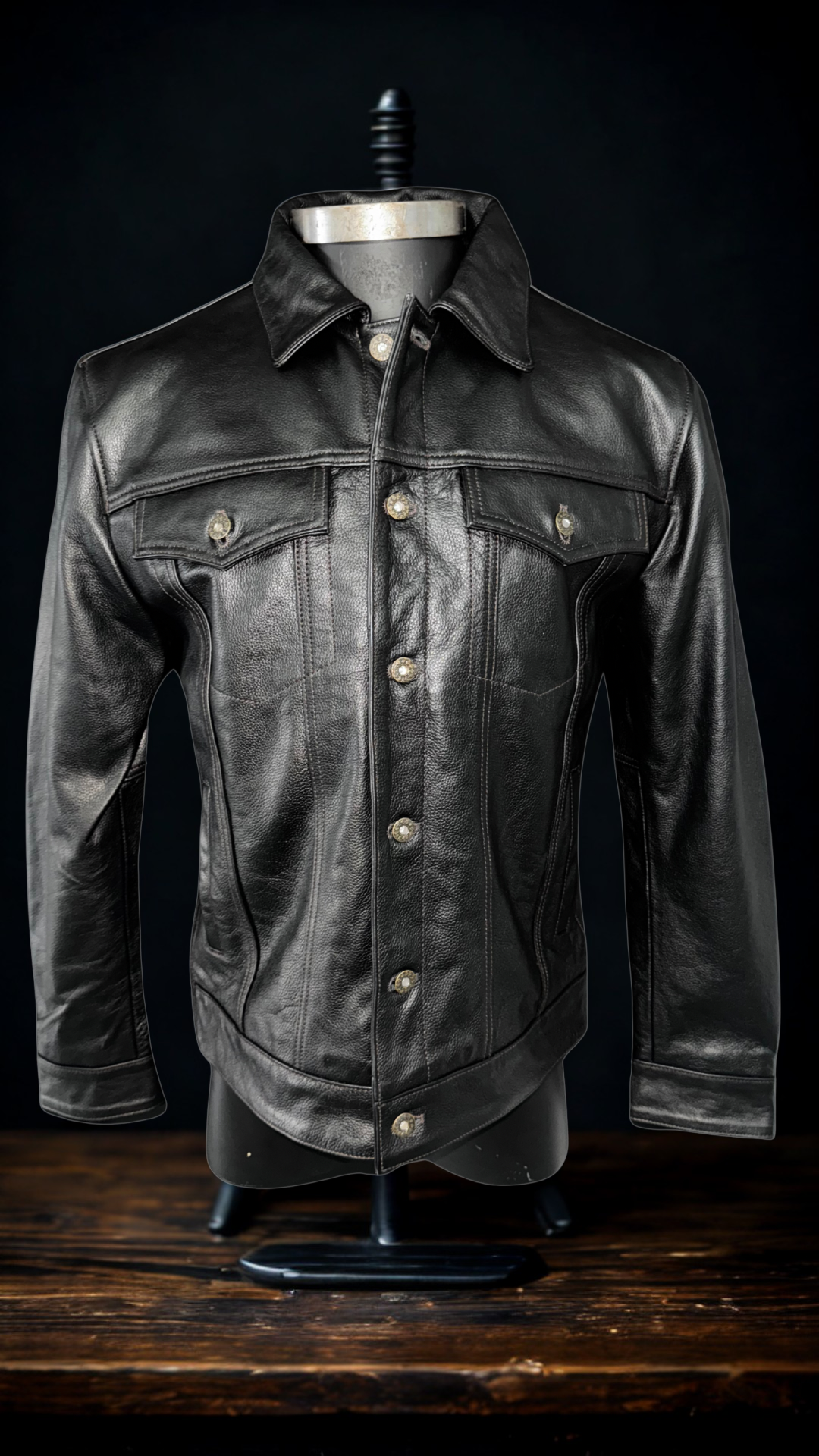 Confeccionada en cuero full grain de vacuno de 1.2 mm, ofrece una presencia sólida, textura natural y la durabilidad que solo la piel de primera calidad puede brindar. Cada costura —realizada con hilo Dark Brown— resalta el carácter robusto de la prenda, mientras que los botones de latón vintage personalizados aportan ese toque clásico que envejece con dignidad y personalidad.