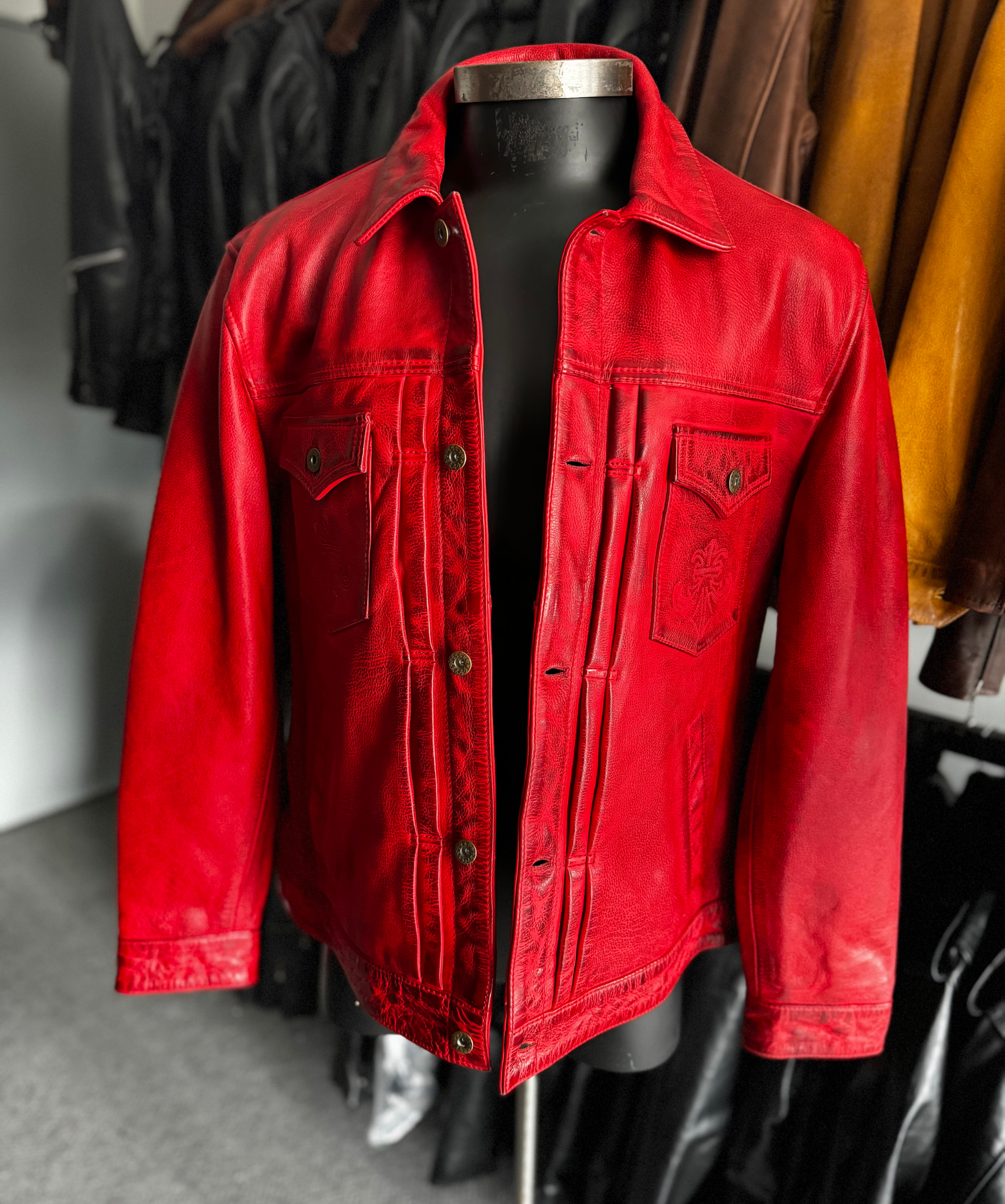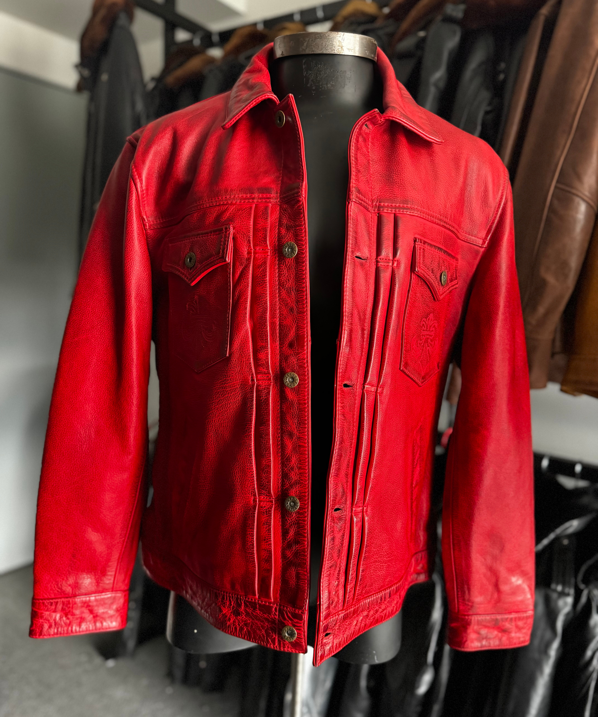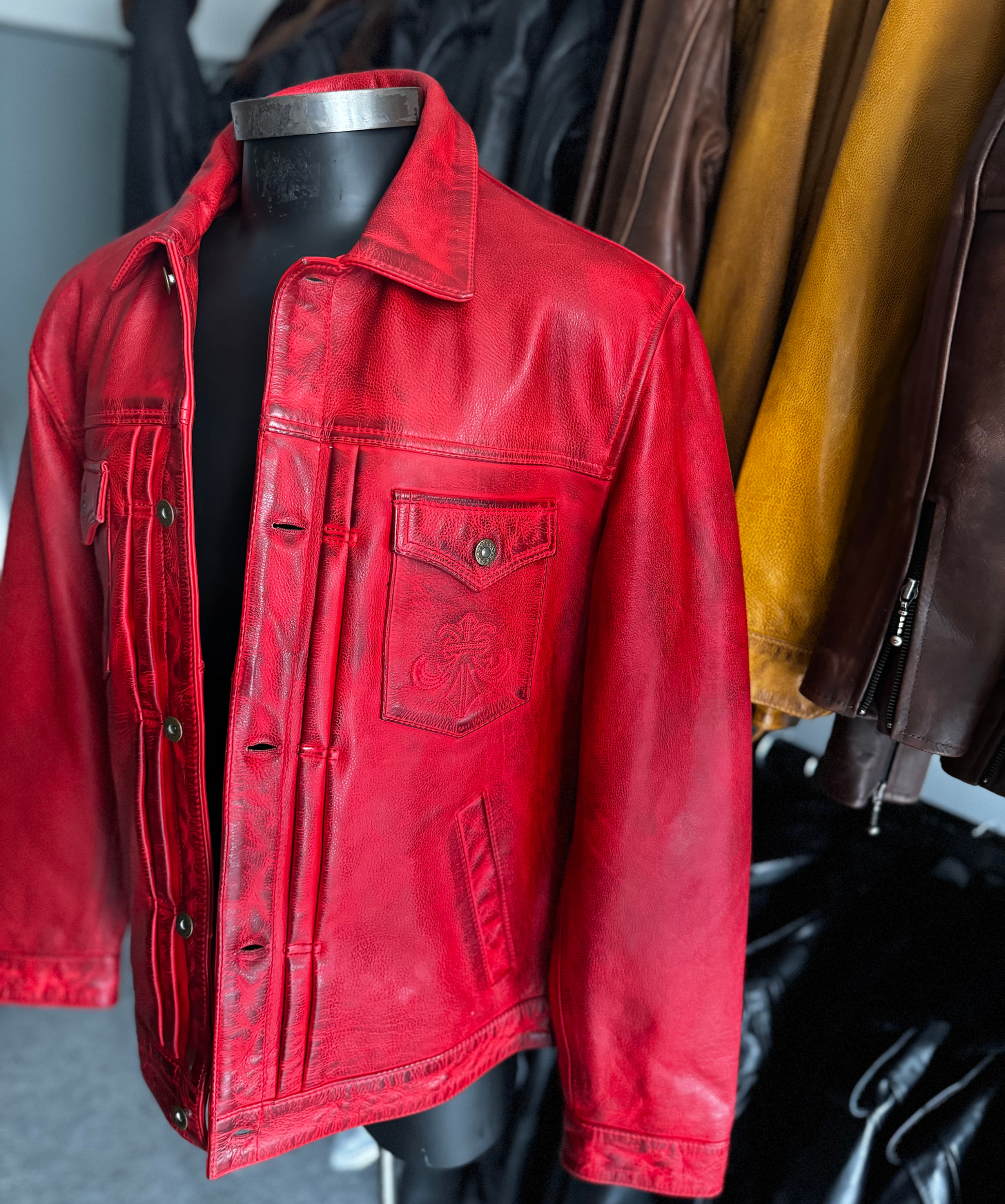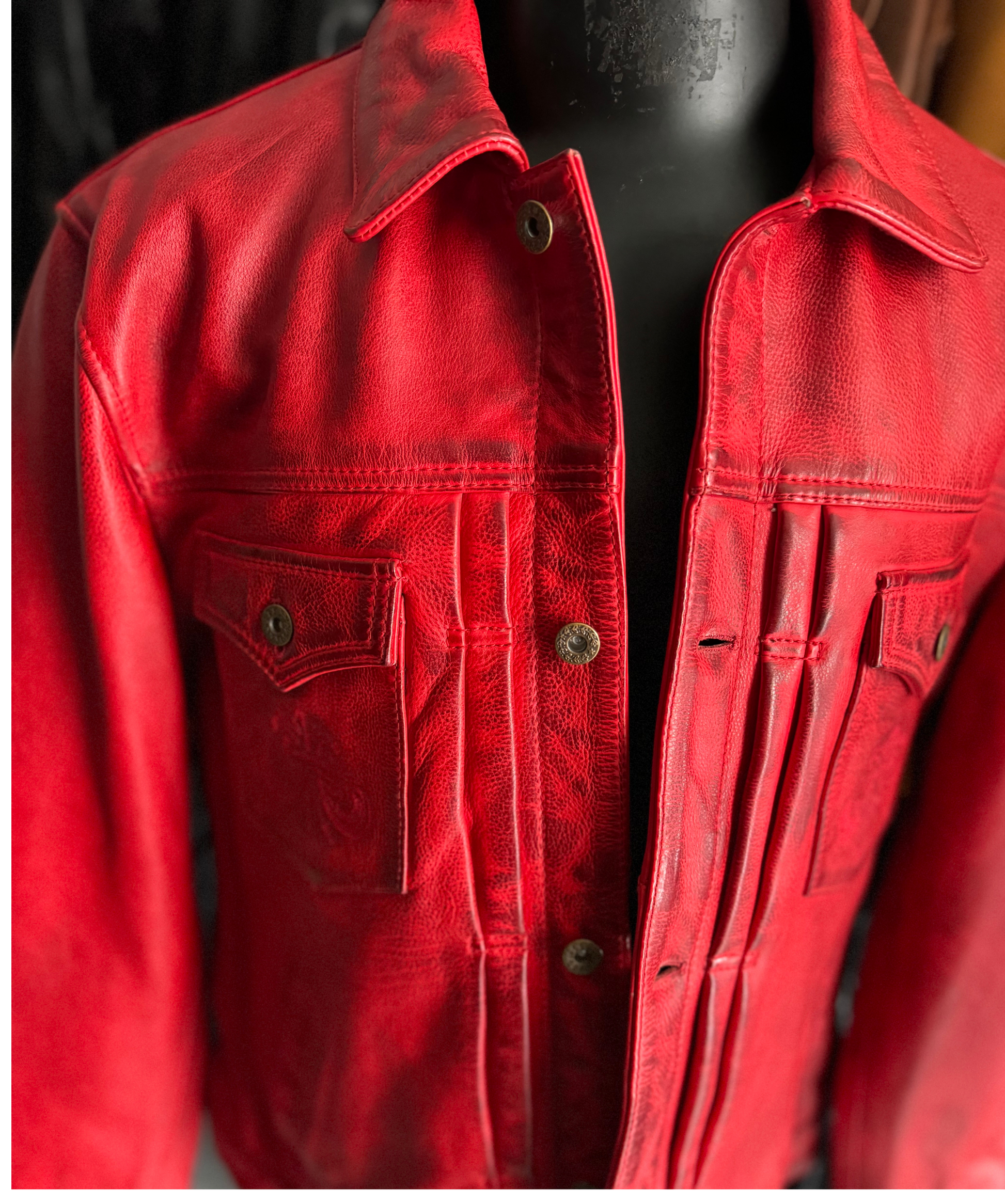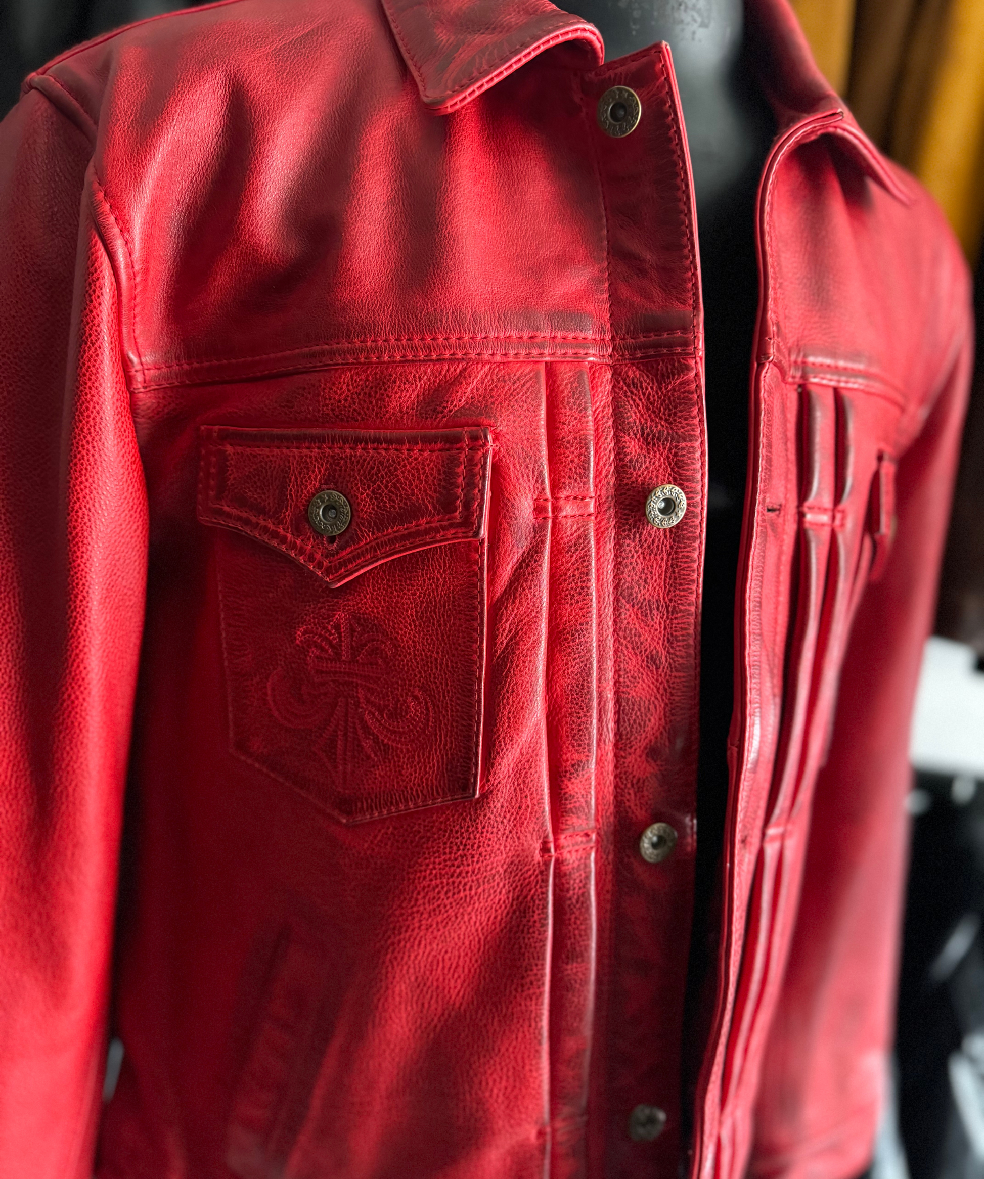 Presentamos la chaqueta de cuero Rupturist, una prenda que desafía los estándares. Hecha de cuero de vaca full grain rojo con sombreados negros, destaca por su textura única y estilo tipo camionero. Con forro de franela y botones antique, esta chaqueta combina calidad y audacia para un look inigualable.