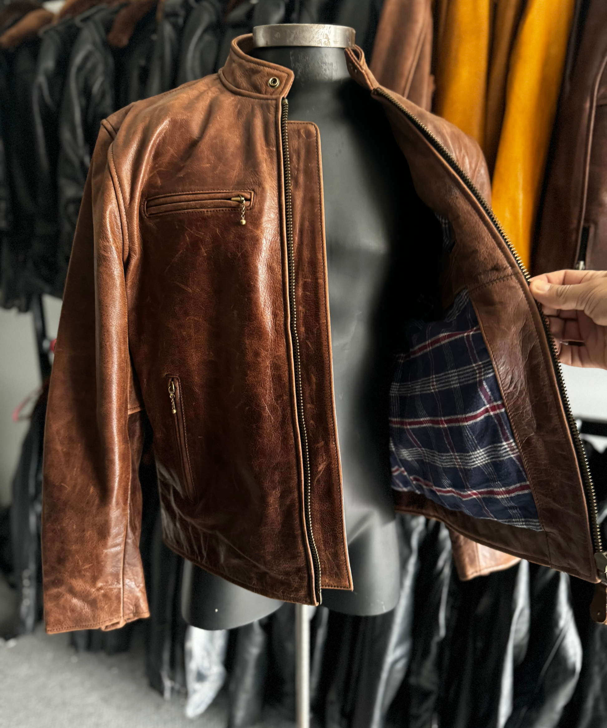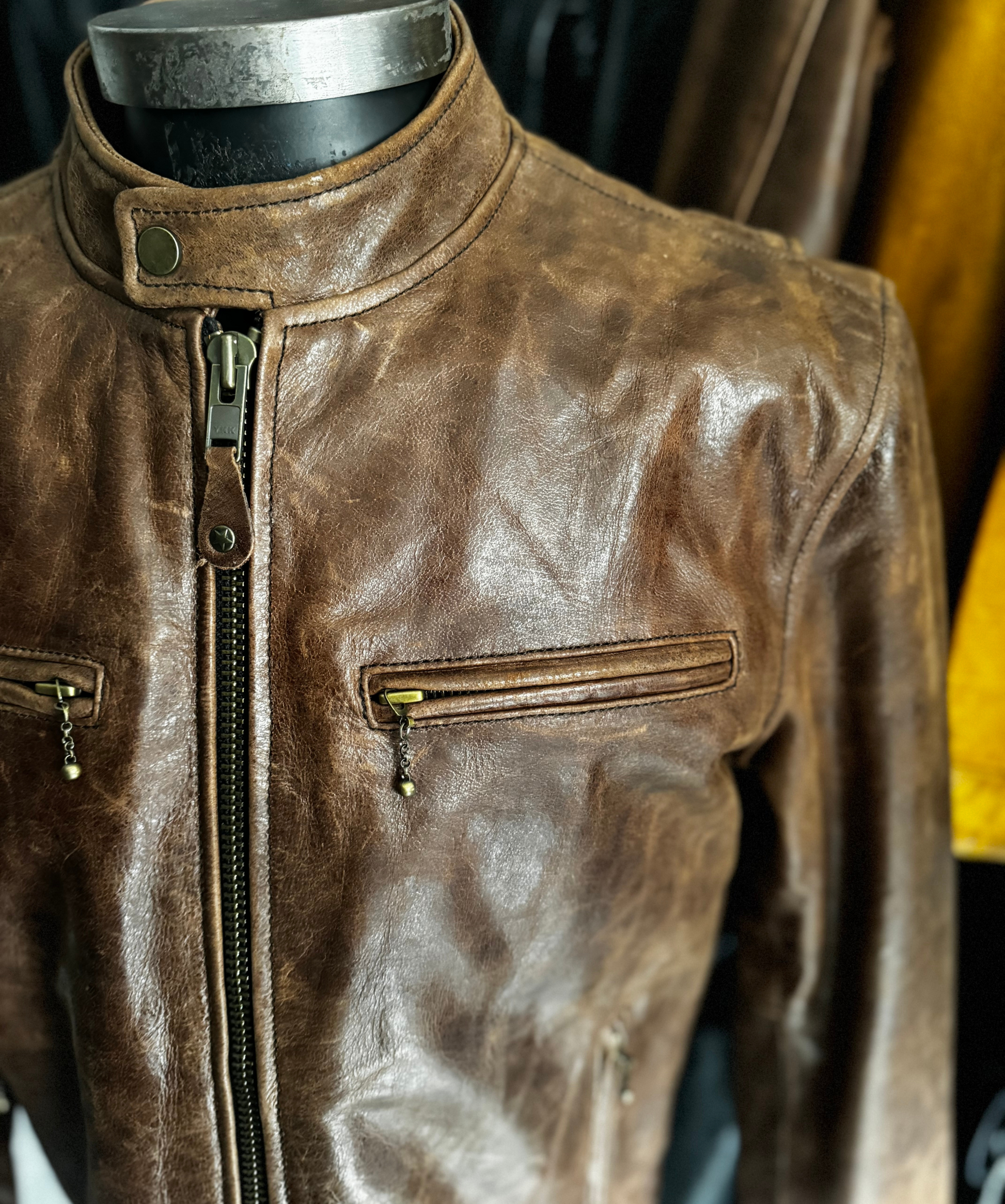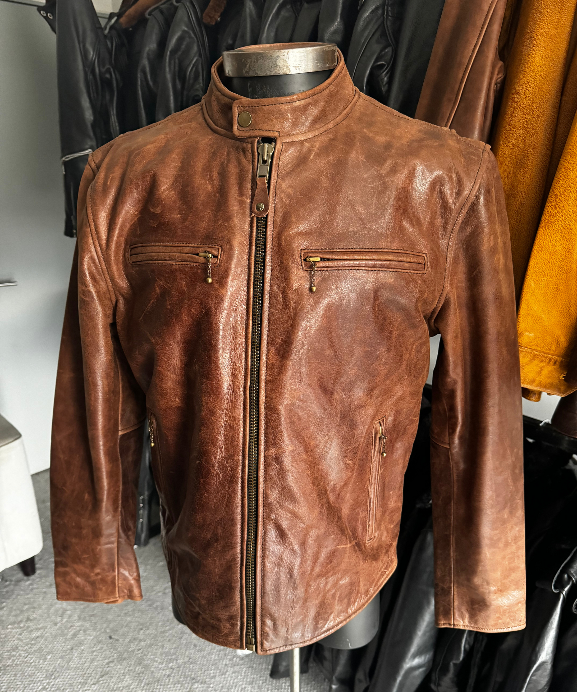 Descubre la chaqueta Vintage Cafe Racer, una pieza única de cuero café texturizado con "arañazos de gato" para un auténtico look vintage. Con el tiempo, desarrolla una pátina única. Fabricada en cuero full grain de 1.2 mm, cuenta con forro de franela, cierre principal YKK de máxima calidad, cierre con cadena en el pecho, bolsillos invisibles y puños con botones. ¡Estilo y durabilidad inigualables!